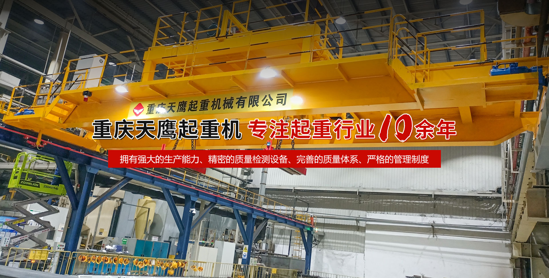重慶天鷹起重機(jī)械有限公司成立于2014年,主營(yíng)起重機(jī)的銷售、安裝和維護(hù)等相關(guān)服務(wù)。中國(guó)重型機(jī)械工業(yè)協(xié)會(huì)員單位、為中國(guó)工程機(jī)械工業(yè)協(xié)會(huì)工程機(jī)械維修分會(huì)會(huì)員單位及西南地區(qū)起重機(jī)械定點(diǎn)安裝維修單位。具有國(guó)家質(zhì)量監(jiān)督檢疫總局頒發(fā)的特種設(shè)備安裝維修改造質(zhì)格證書。并率先通過了IS09001-2000質(zhì)量體系認(rèn)證。 公司注冊(cè)資金3000萬元;廠房面積2萬平方米;各種生產(chǎn)檢測(cè)設(shè)備50臺(tái)套,公司技術(shù)力量雄厚,聘請(qǐng)了國(guó)內(nèi)知名起重機(jī)專家、工程技術(shù)人員擔(dān)當(dāng)項(xiàng)目經(jīng)理、技術(shù)總工程師及顧問。現(xiàn)擁有員工100多人,其中工程技術(shù)人員12人。 主導(dǎo)產(chǎn)品為各類橋、門式起重機(jī)及輕小型起重設(shè)備,具備生產(chǎn)起重量200t及以下通用橋、門式起重機(jī)的能力,尤其在200t以下起重機(jī)產(chǎn)品上具備較強(qiáng)的市場(chǎng)競(jìng)爭(zhēng)力,為許多行業(yè)設(shè)計(jì)制造了技術(shù)含量高、技術(shù)性強(qiáng)的起重設(shè)備,許多產(chǎn)品在原設(shè)計(jì)標(biāo)準(zhǔn)上進(jìn)行了較大的改進(jìn)、優(yōu)化和創(chuàng)新;其中NH型系列電動(dòng)葫蘆、HD型電動(dòng)單梁處于國(guó)內(nèi)高水平..... 好的產(chǎn)品品質(zhì)需要由較高的裝備水平來保證,公司購(gòu)買了“大型數(shù)控落地鏜”、“數(shù)控切割機(jī)床”、“自調(diào)式焊接滾輪機(jī)”、“數(shù)顯液壓板料折彎?rùn)C(jī)”、“超大型數(shù)控臥式車床”、“數(shù)控液壓水平下調(diào)式三輥卷板機(jī)”、“單柱移動(dòng)式立式車床”“擁有用于單梁生產(chǎn)的全國(guó)一條拋丸噴漆烘干線、葫蘆噴漆烘干線和全國(guó)較大的100T葫蘆試驗(yàn)臺(tái)和檢測(cè)中心”等各種先進(jìn)的加工設(shè)備,新建廠房面積近2萬平方米。 質(zhì)量是企業(yè)的生命,天鷹公司依據(jù)“ISO 9001國(guó)際質(zhì)量管理體系”標(biāo)準(zhǔn),制定并完善了公司的質(zhì)量管理體制。堅(jiān)持質(zhì)量體系的內(nèi)審和外審,將質(zhì)量管理工作落實(shí)到企業(yè)生產(chǎn)經(jīng)營(yíng)的全過程。 您的微笑,是天鷹永恒的追求;天鷹的服務(wù),是您首要的選擇!因?yàn)槲覀儓?jiān)信:“誠(chéng)信是本、質(zhì)量鑄就品牌”。為您服務(wù)是我們的榮耀,勤奮而進(jìn)取的天鷹人,時(shí)刻期盼著您的到來。